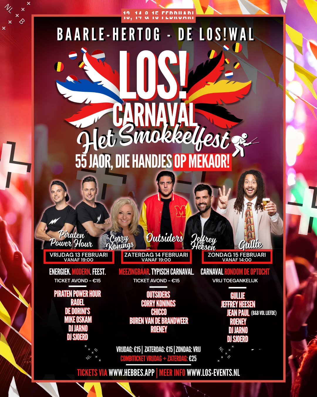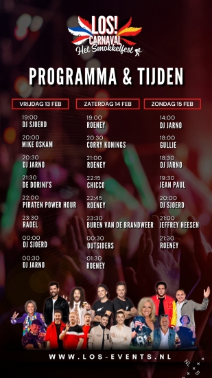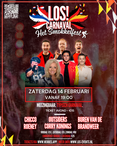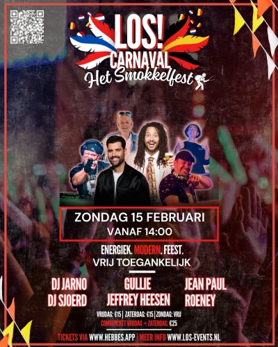 LOS! Carnaval – Het Smokkelfest is hét nieuwe carnavalsevenement van Baarle-Hertog en omstreken. Van 13 t/m 15 februari 2026 toveren we de LOS!wal om tot een professioneel festivalterrein. We combineren moderne festival vibes op vrijdag met traditionele carnavalsgezelligheid op zaterdag en zondag. Het event wordt mede mogelijk gemaakt door Den Engel.
